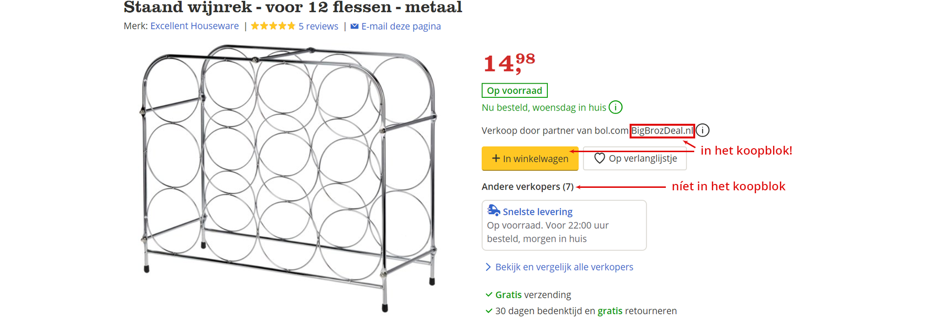 - Stimuleer marktplaatsen als Amazon, Bol en VidaXL om jouw producten te tonen in het koopblok. Op het moment dat je hierin staat wordt het artikel bij jou gekocht als men klikt op ‘in winkelwagen’. Je kunt dit beïnvloeden door ervoor te zorgen dat een aantal variabelen optimaal zijn, zoals je zekerheid van levering, levertijd, prijs en serviceniveau.