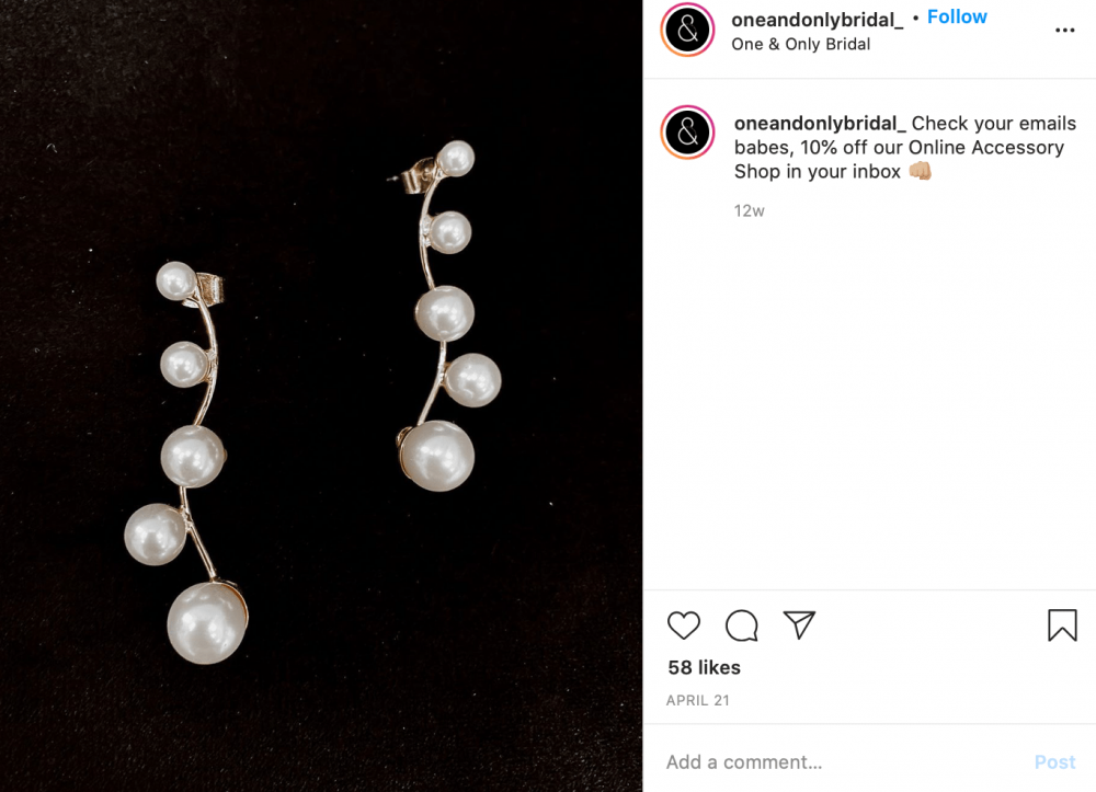 Gebruik relevante hashtags zoals #bruidssieraden en maak waar mogelijk gebruik van Instagram Shopping-functies om je producten te taggen en het aantal aankopen via de app te verhogen.