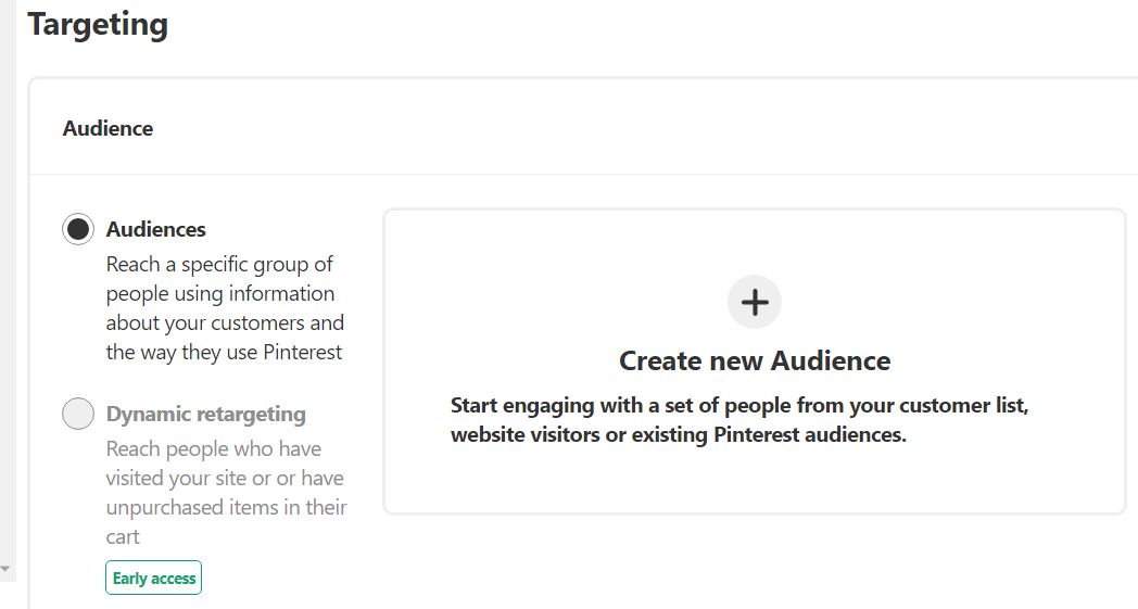 We kunnen deze optie ‘Prospecting’ noemen. U kunt ook een aangepaste doelgroep maken op basis van e-maillijsten, eerdere bezoekers van uw site of mensen met interesse in uw pins. Zelfs in dit geval zijn geen interesses of zoekwoorden vereist. De optie Dynamic Retargeting is nog redelijk nieuw. Het vereist een volledige Pinterest eCommerce tag-implementatie om bezoeken van productpagina’s, winkelmandjes, aankopen etc. bij te houden.