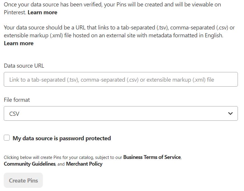 De productcatalogus lijkt erg op die van Google Shopping met verschillende verplichte en veel optionele velden. Als u een Pinterest business account hebt aangemaakt kunt u uw productfeed uploaden via het catalogusgedeelte in het tabblad Ads.