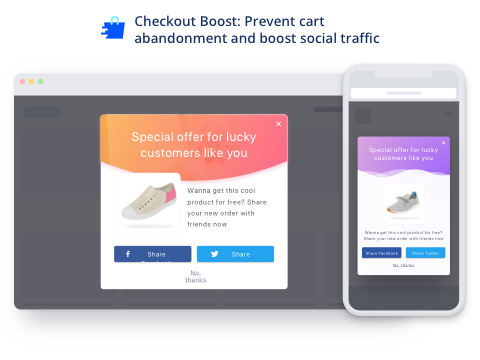 Wist je dat 74% van de online shoppers vertrouwd op berichten op Social Media bij hun aankoop? Om hier gebruik van te maken introduceren wij de Checkout Boost app om jouw klanten te motiveren een order te plaatsen en nieuwe leads aan te leveren via sociale netwerken.