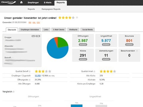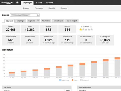 CleverReach is een krachtige applicatie voor e-mailmarketing. Met CleverReach kunt u professionele e-mails opstellen, veilig versturen, resultaten meten en ontvangers beheren. CleverReach levert sinds maart 2007 technologie voor e-mailmarketing. Inmiddels helpt het duizenden klanten wereldwijd met het versturen van e-mails, het beheer van lijsten van ontvangers en het meten en analyseren van emailcampagnes. Met een paar muisklikken maakt u individueel vormgegeven landingpagina's en aanmeldformulieren aan voor uw eigen websites.