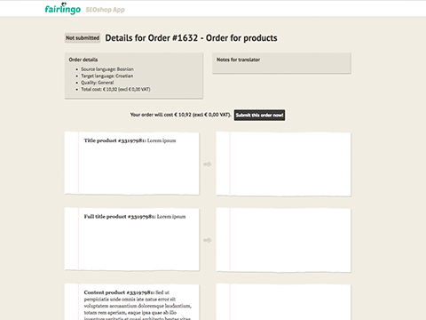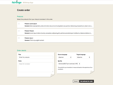 Nadat je onze gratis app hebt gedownload en een Fairlingo account hebt aangemaakt, selecteer je de gewenste content en ontvang je direct een overzicht van de kosten. Als dit naar wens is kun je de vertaling direct bestellen. Zodra de content vertaald is wordt deze ingeladen in de webshop. Je kunt de vertaling live volgen en tijdens het vertalen kan er contact worden opgenomen met de vertaler indien nodig.