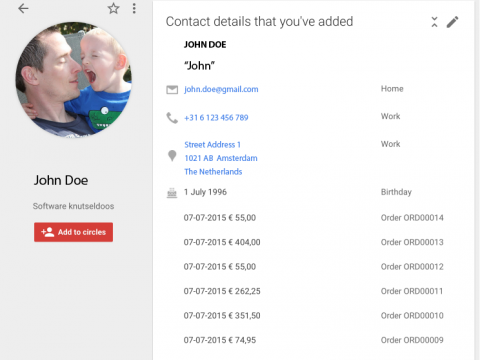 Gmail contacts app synchroniseert klant- en order gegevens naar uw Gmail account.