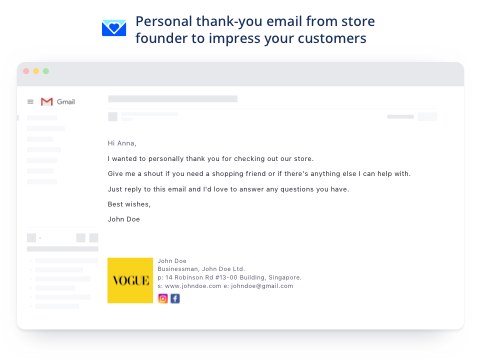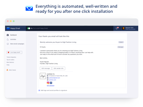 Happy Email stuurt automatisch een 'bedank' email naar jouw klanten, 30 minuten nadat ze hun eerste bestelling hebben gedaan of een account hebben aangemaakt. Hiermee maak je het persoonlijk en creeer je vertrouwen.