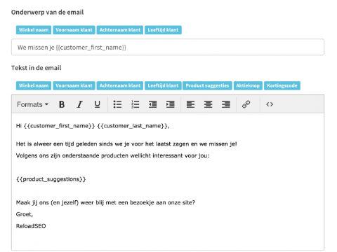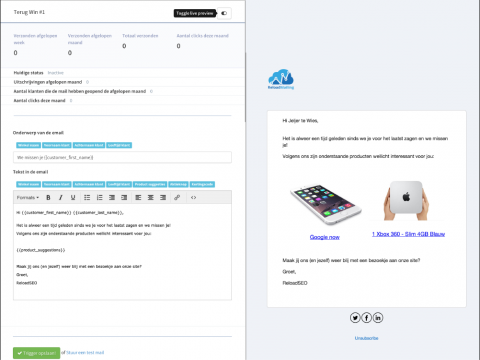 In ReloadMailing stel je in welke van de triggers jij wilt aanzetten. We bieden je een groot scala standaard emails aan die je zelf naar wens kunt aanpassen! Aangezien ReloadMailing naadloos op jouw shop is aangesloten maakt de app automatisch kortingscodes aan en leest die jouw klantenbestand uit om zo op het juiste moment de juiste mail te sturen. Zo zorg je ervoor dat jouw mailtjes super persoonlijk blijven!