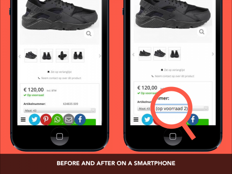 Verkoop je producten met product opties zoals maten, liters of m2? Houd je de voorraad daarvan bij? Dan heb je vast gemerkt dat standaard alle ingevoerde product opties worden getoond op de productpagina, ook degene die niet op voorraad zijn. Pas na het selecteren van een optie zie je pas of deze op voorraad is of niet. Dit kost tijd, moeite en uiteindelijk verlies je hier klanten door. Bovendien zijn dit meerdere nee-verkopen achter elkaar wat frustrerend is voor een klant.
