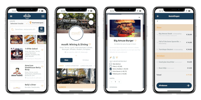 Amuse is een online platform en app voor de horeca voor een optimale horecabeleving. Ontwikkeld vanuit gastperspectief en in samenwerking met, is Amuse dé interactieve entree naar een onvergetelijke horeca- en klantbeleving. Met Amuse kan de gast eenvoudig én veilig een horecabezoek naar eigen wens finetunen: van het vinden van het juiste restaurant, het plaatsen van een reservering en het bekijken van de menukaart tot aan het bestellen en afrekenen via de eigen smartphone. En voor jou als horecaondernemer biedt Amuse alles wat je nodig hebt om alles optimaal op de wensen van jouw gast af te stemmen. Zo krijgen gasten en horecaondernemers samen een ultieme grip op verwachting en beleving.