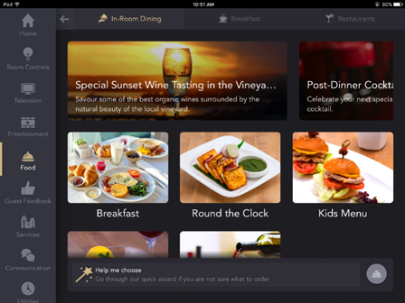 - Hotel Services: Simplified in-room ordering experience for food and beverages, thanks to interactive menus with detailed and pictorial food descriptions and ability to customize food preparation by indicating preferred ingredients / ingredients to avoid. Guests can review the interactive hotel services directory and avail any facility with ease including reviewing the spa menu and booking a spa appointment online or requesting pillow preferences.